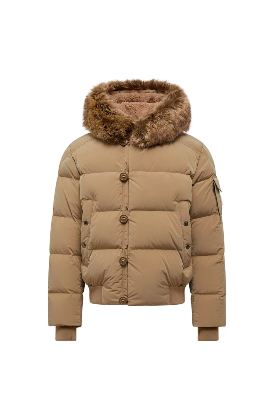 Modèle conçu en microfibre technique Doublure en polyester Bordure en laine Rembourrage en duvet Capuche réglable avec doublure en teddy molletonné, bordure en matière synthétique et bande logo Fermeture zippée et boutonnée Poches à bouton-pression Poche zippée sur la manche Poche intérieure zippée